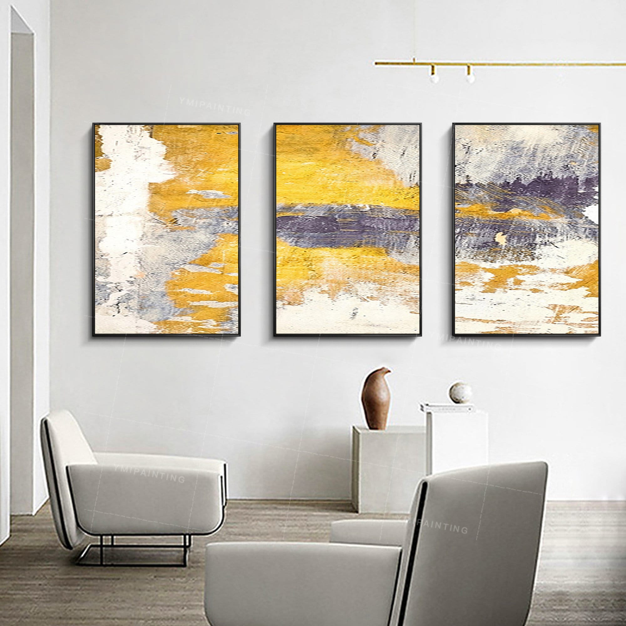 Set Of 3 Wall Art Large Abstract Purple Painting Mustard Etsy